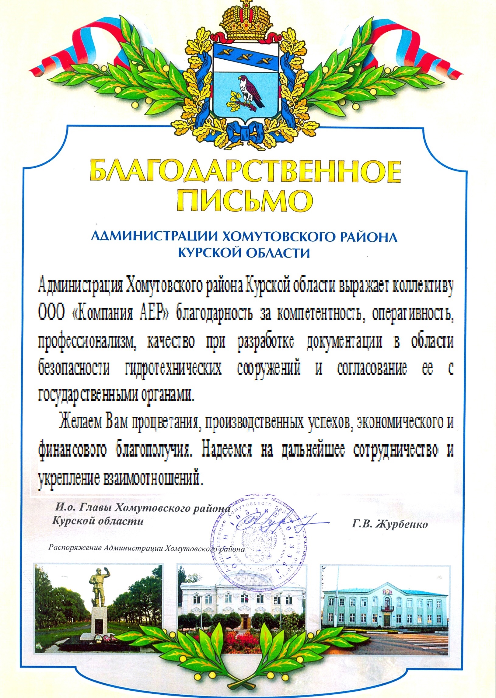Администрация Хомутовского района Курской области выражает коллективу ООО "Компания АЕР" благодарность за компетентность , оперативность, профессионализм, качество при разработке документации в области безопасности гидротехнических сооружений и согласование ее с государственными органами. Желаем Вам процветания, производственных успехов, финансового и экономического благополучия. Надеемся на дальнейшее сотрудничество и укрепление взаимоотношений.