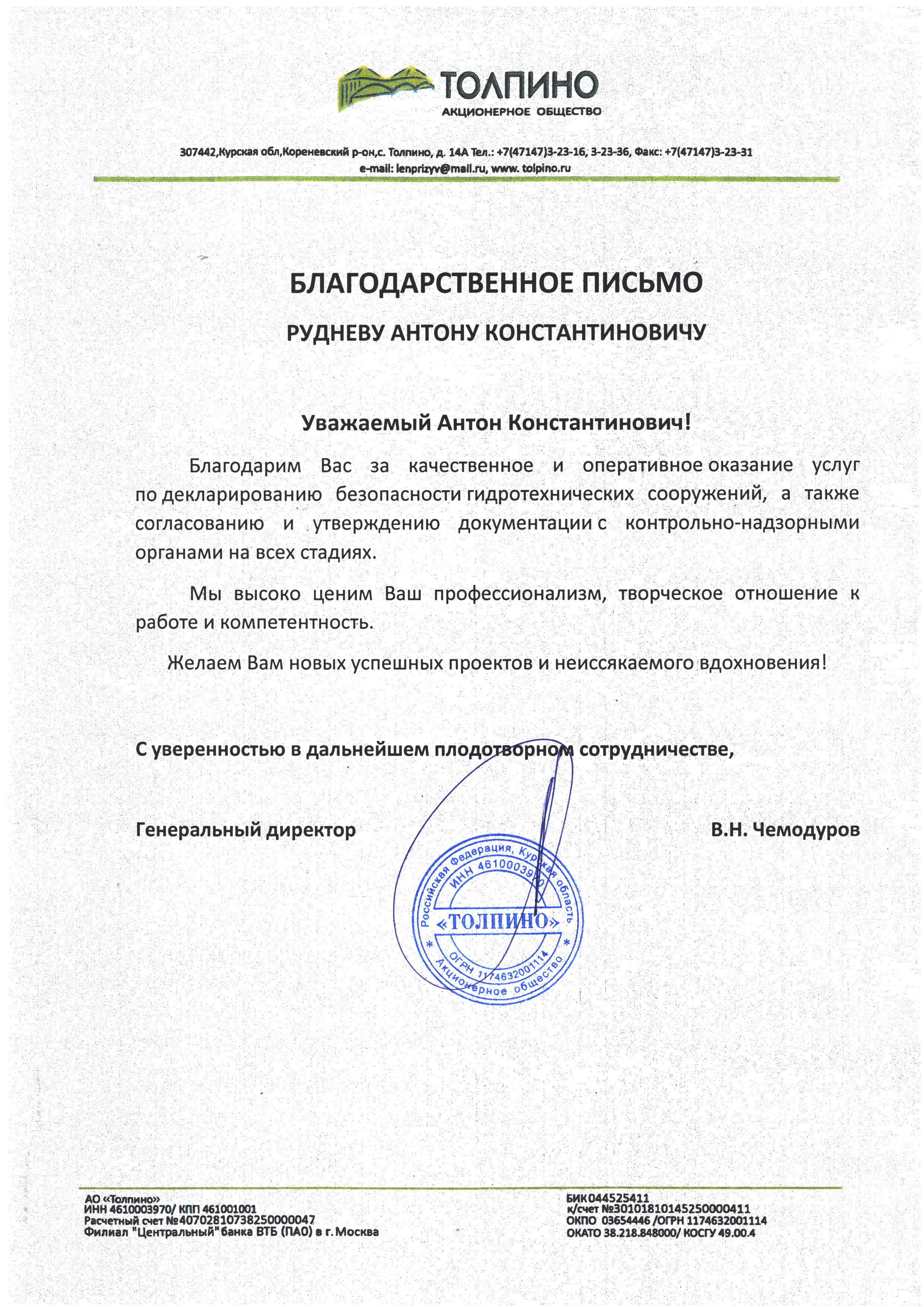 «АО «Толпино» выражает благодарность Рудневу А. К. за качественное и оперативное оказание услуг по декларированию безопасности гидротехнических сооружений, согласованию и утверждению документации с контрольно-надзорными органами на всех стадиях».