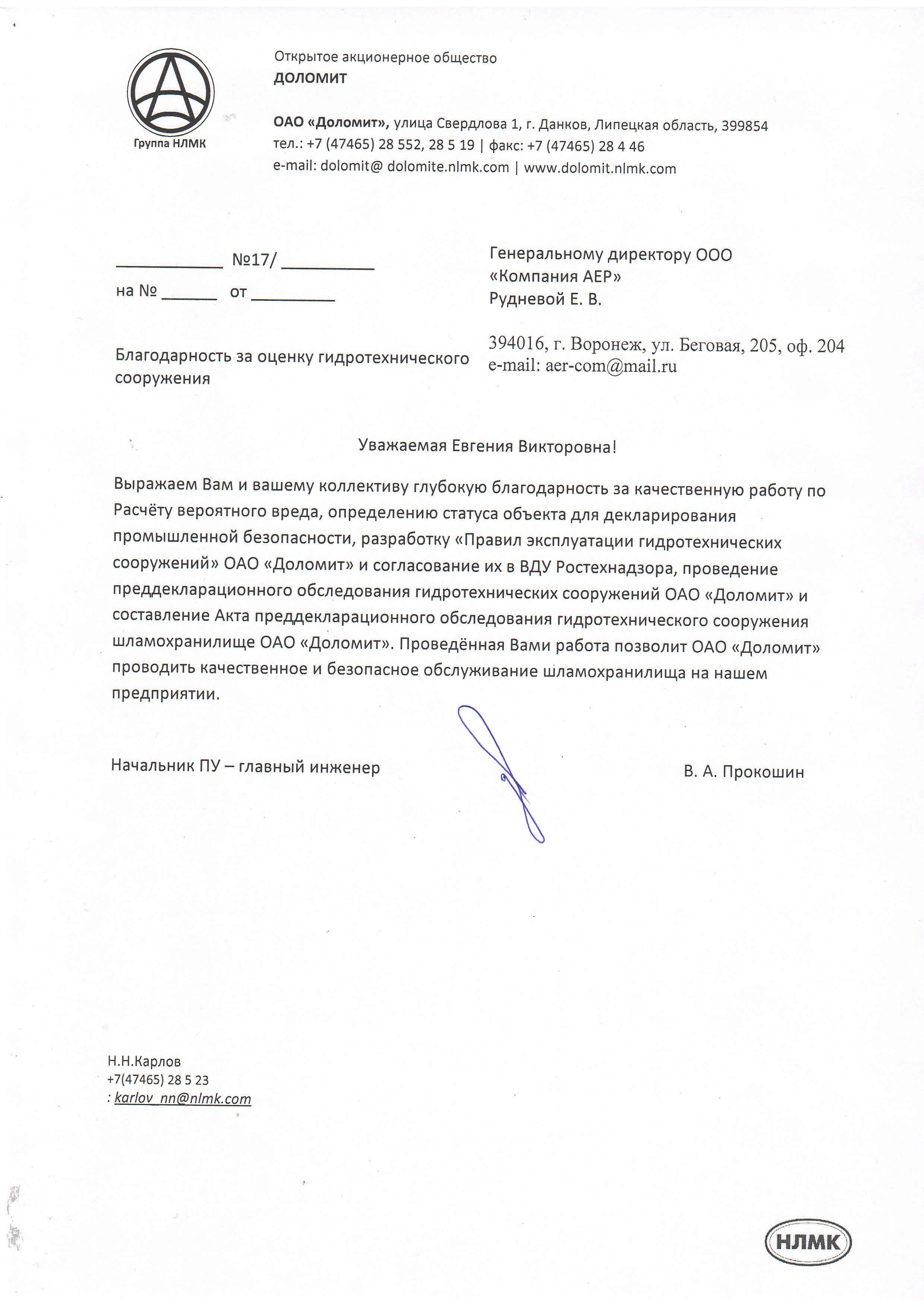 Выражаем Вам и вашему коллективу глубокую благодарность за качественную работу по Расчёту вероятного вреда, определению статуса объекта для декларирования промышленной безопасности, разработку «Правил эксплуатации гидротехнических сооружений» ОАО «Доломит» и согласование их в ВДУ Ростехнадзора, проведение преддекларационного обследования гидротехнических сооружений ОАО «Доломит» и составление Акта премекларационного обследования гидротехнического сооружения шламохранилище ОАО «Доломит». Проведённая Вами работа позволит ОАО «Доломит» проводить качественное и безопасное обслуживание шламохранилища на нашем предприятии.