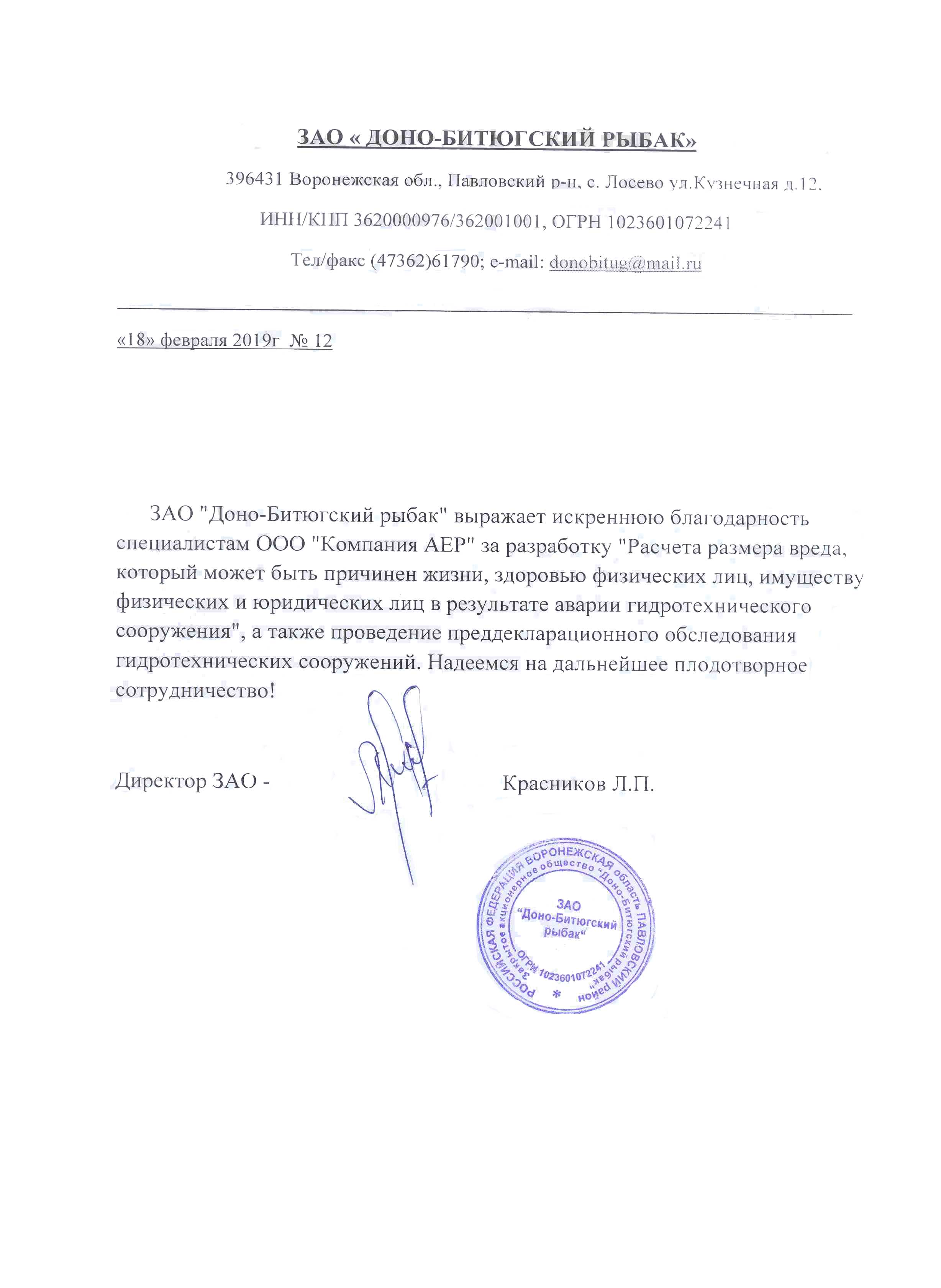 ЗАО "Доно-Битюгский рыбак" выражает искреннюю благодарность специалистам ООО "Компания АЕР" за разработку "Расчета размера вреда, который может быть причинен жизни, здоровью физических лиц, имуществу физических и юридических лиц в результате аварии гидротехнического сооружения", а также проведение преддекларационного обследования гидротехнических сооружений. Надеемся на дальнейшее плодотворное сотрудничество!